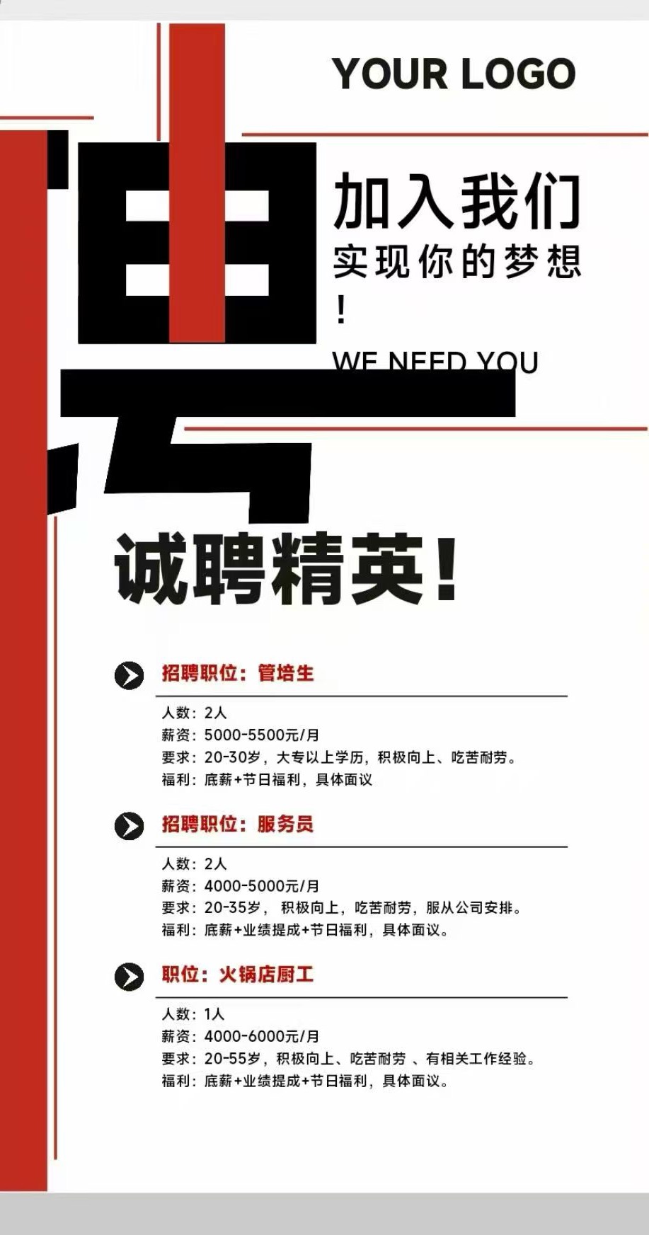 招聘职位:服务员人数:2人