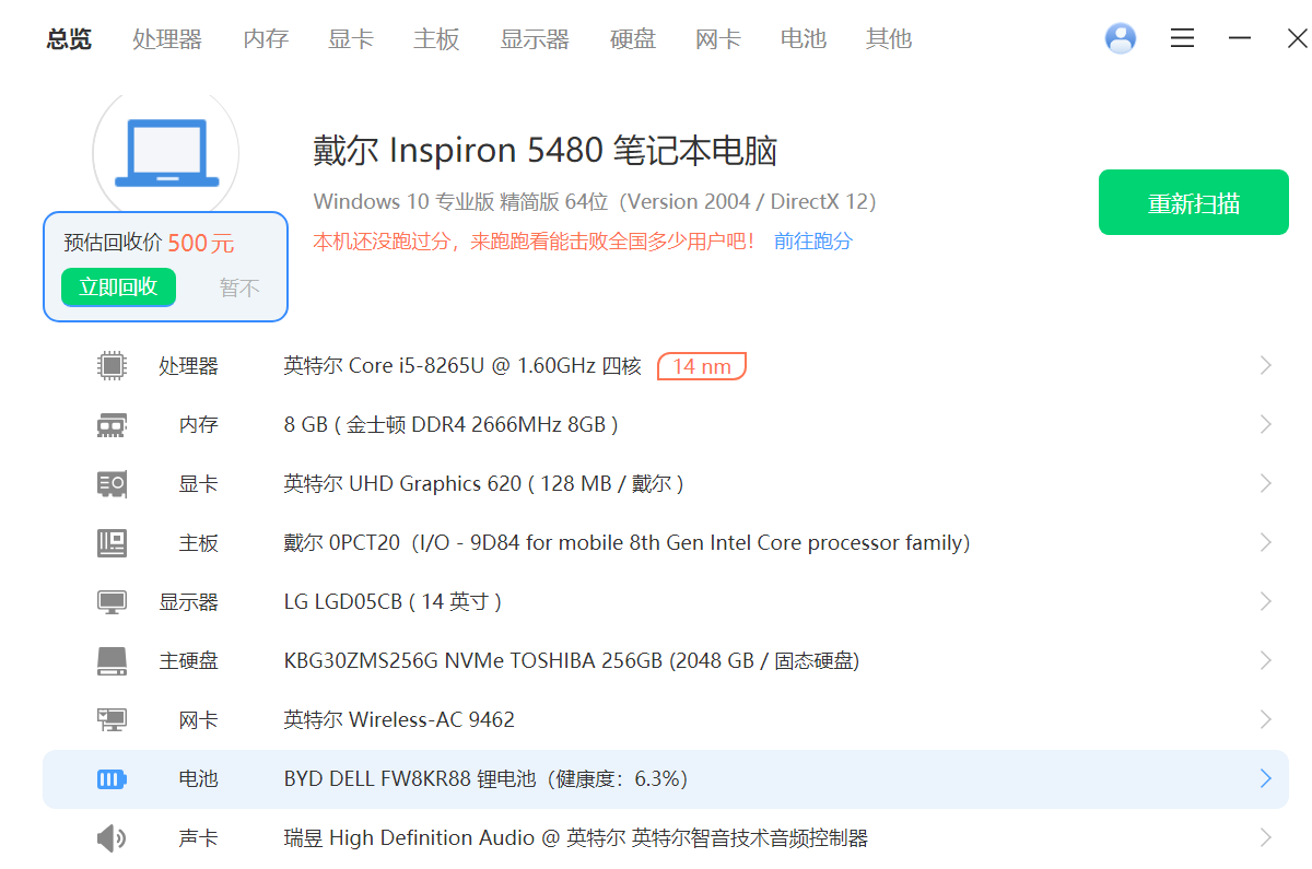戴尔笔记本(5480),具体配置看图,14寸1920×1080高清窄边屏,运行流畅(10以内开关机),适合日常办公娱乐,网课学习。电池i续航能力差,屏幕划痕明显但不影响正常显示使用(无亮点,无坏点),外壳明显使用痕迹,所有接囗和功能正常,无维修。450元。