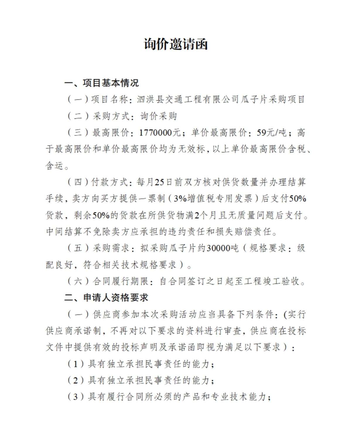 泗洪县交通工程有限公司瓜子片采购项目询价公告