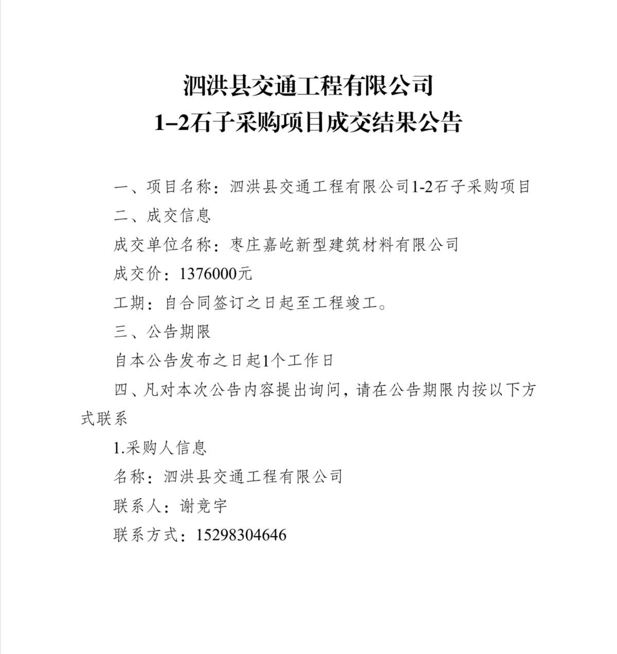 泗洪县交通工程有限公司1-2石子采购项目成交结果公告