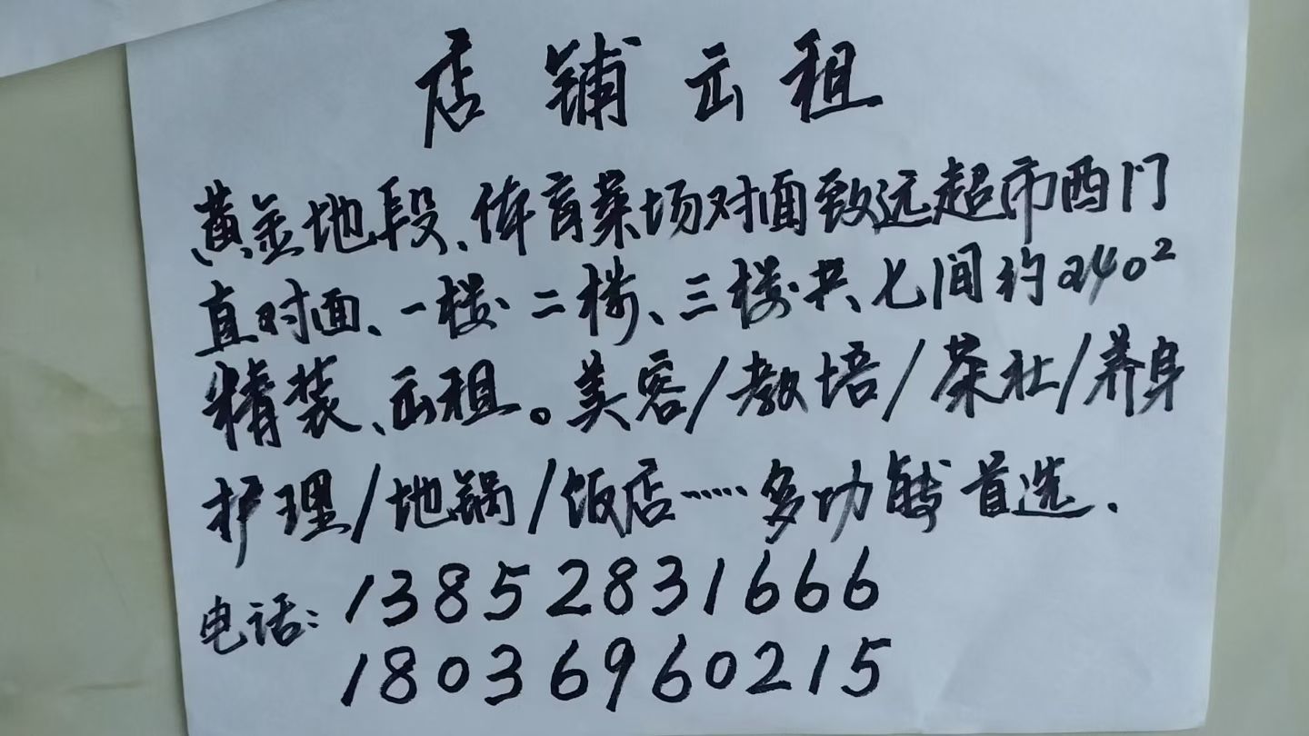 黄金地段 -体育场菜场对面致远超市西门直对面,1楼,2楼,三楼,共7间约240平,精装出租,可以做美容/教培社/养身护理/地锅店....多功能首选 电话:13852831666 18036960215