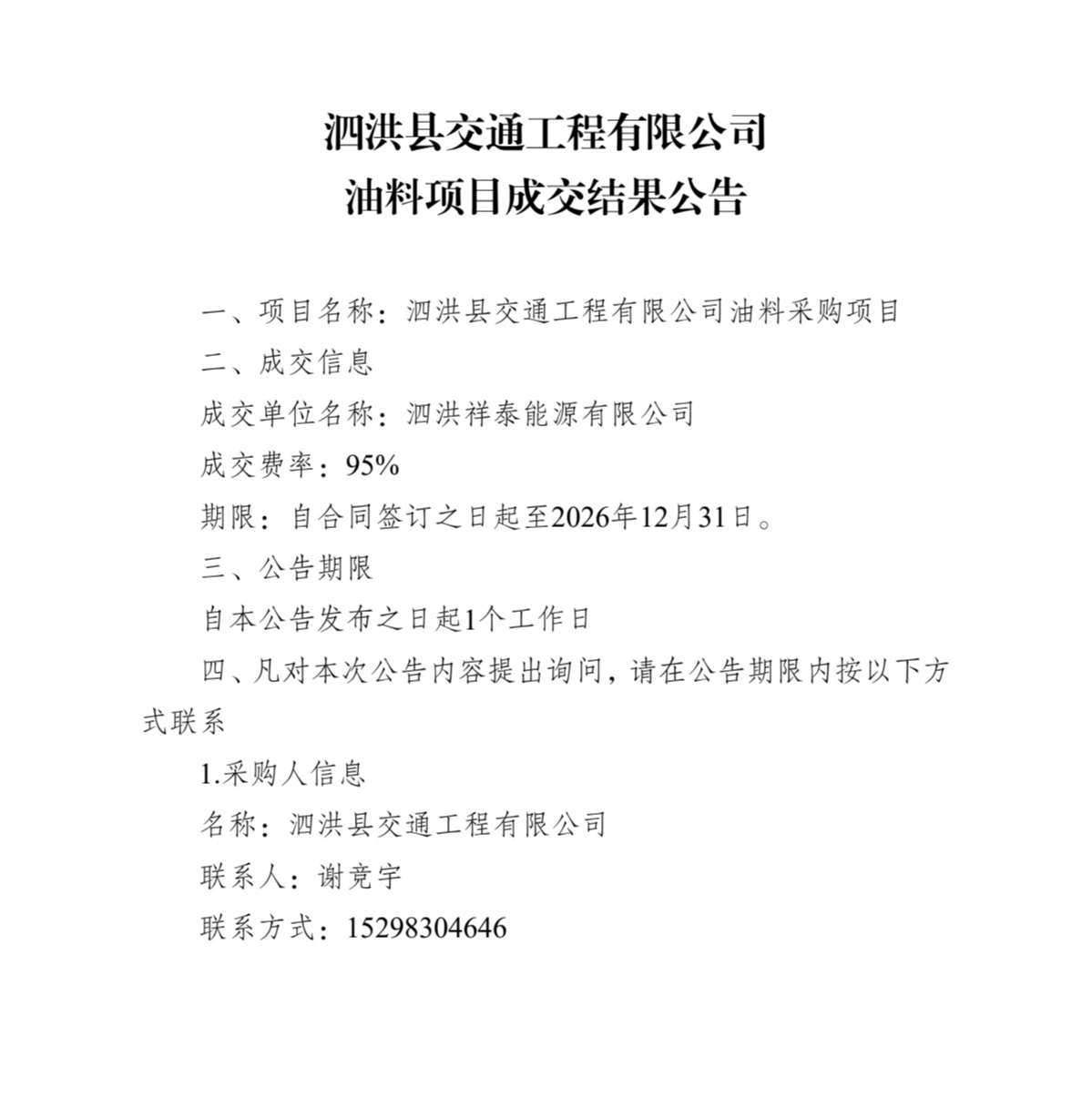 泗洪县交通工程有限公司油料采购项目成交结果公告