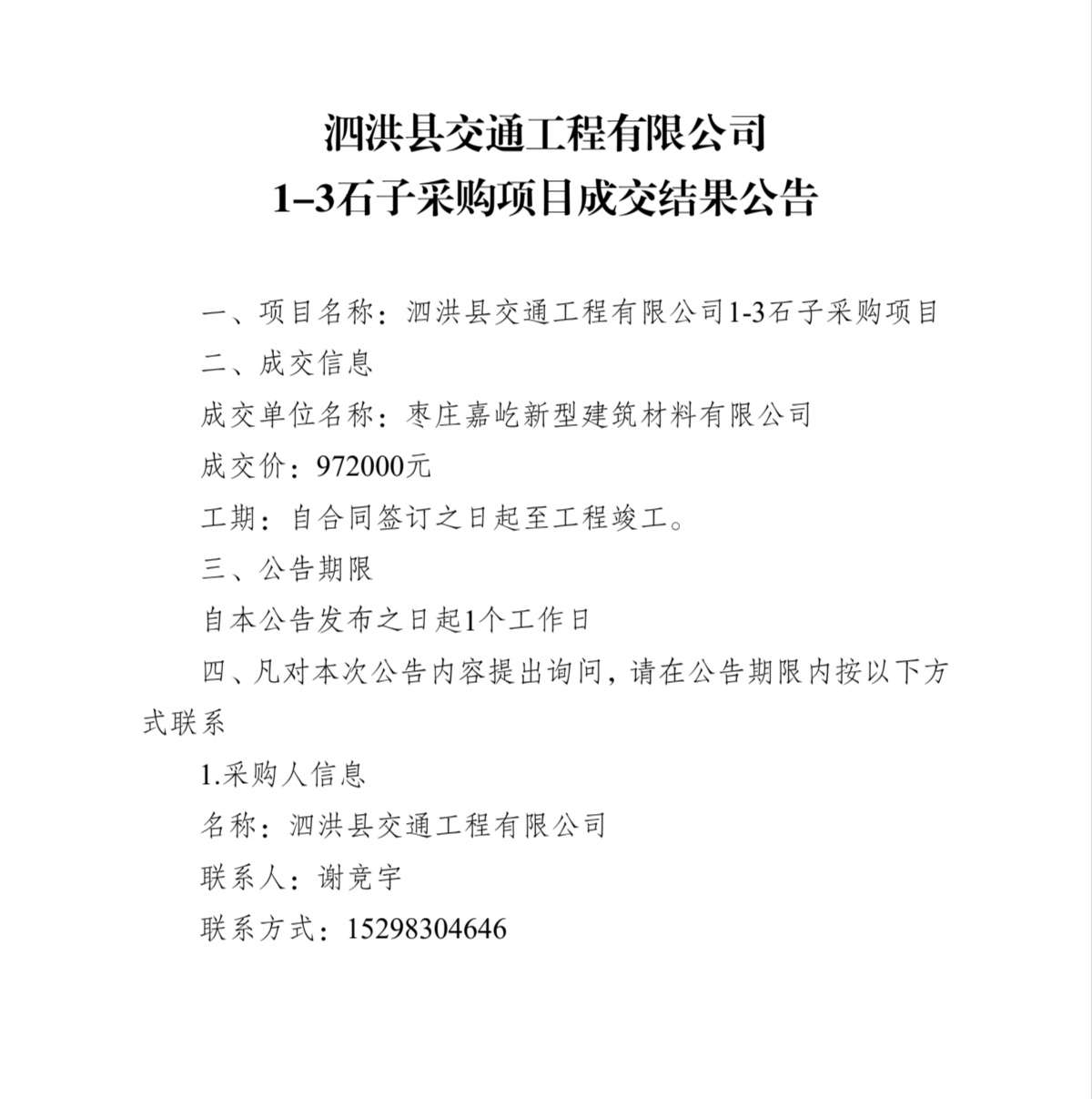 泗洪县交通工程有限公司1-3石子采购项目成交结果公告