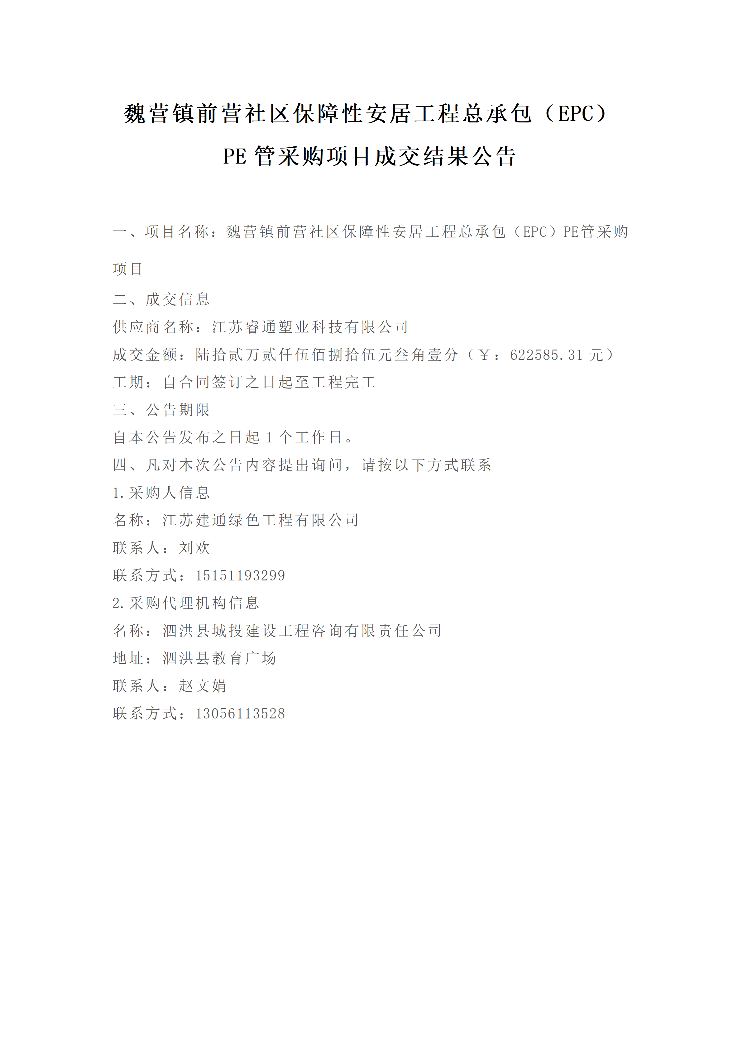 魏营镇前营社区保障性安居工程总承包(EPC)PE管采购项目成交结果公告