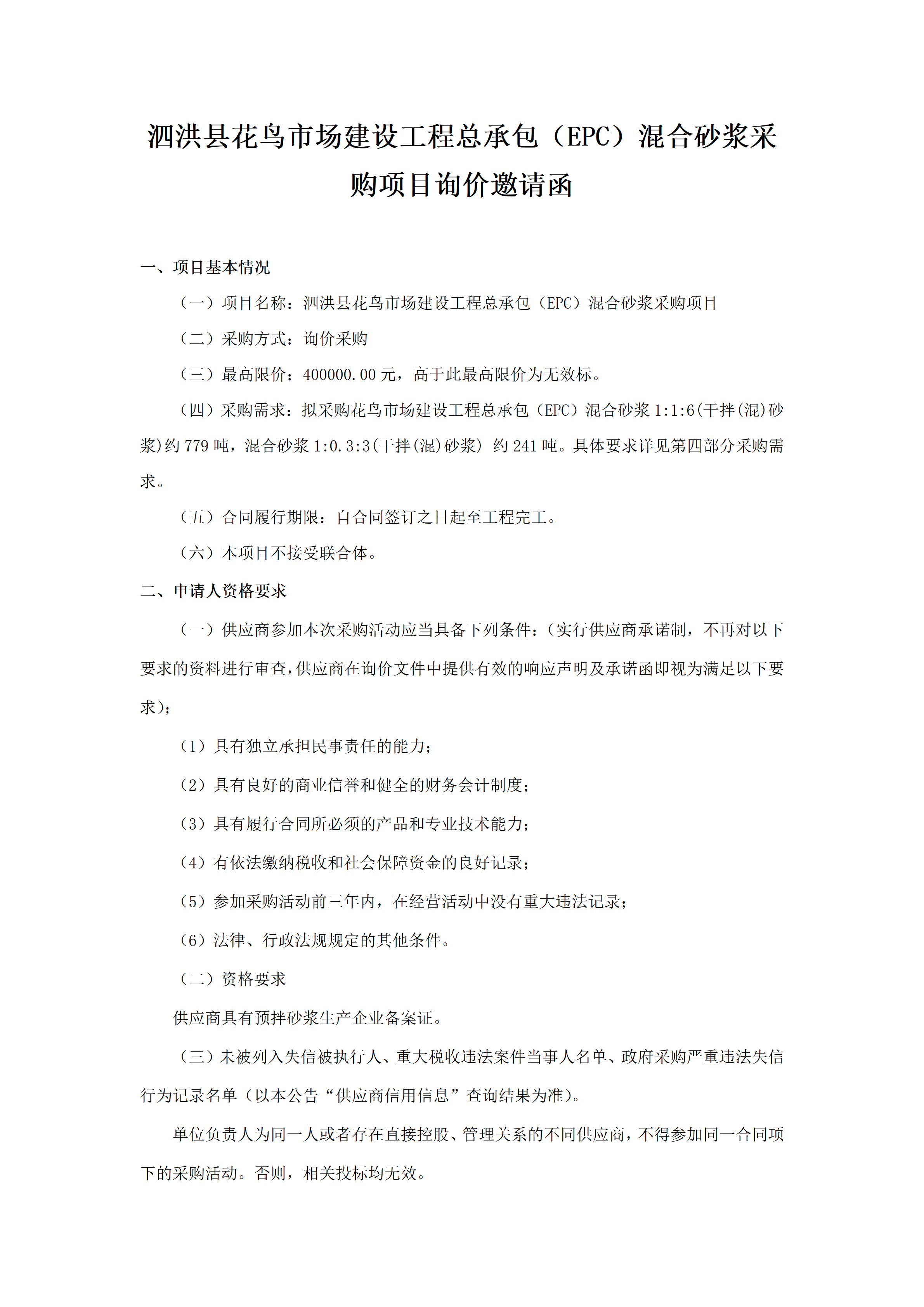 泗洪县花鸟市场建设工程总承包(EPC)混合砂浆采购项目 询价邀请函