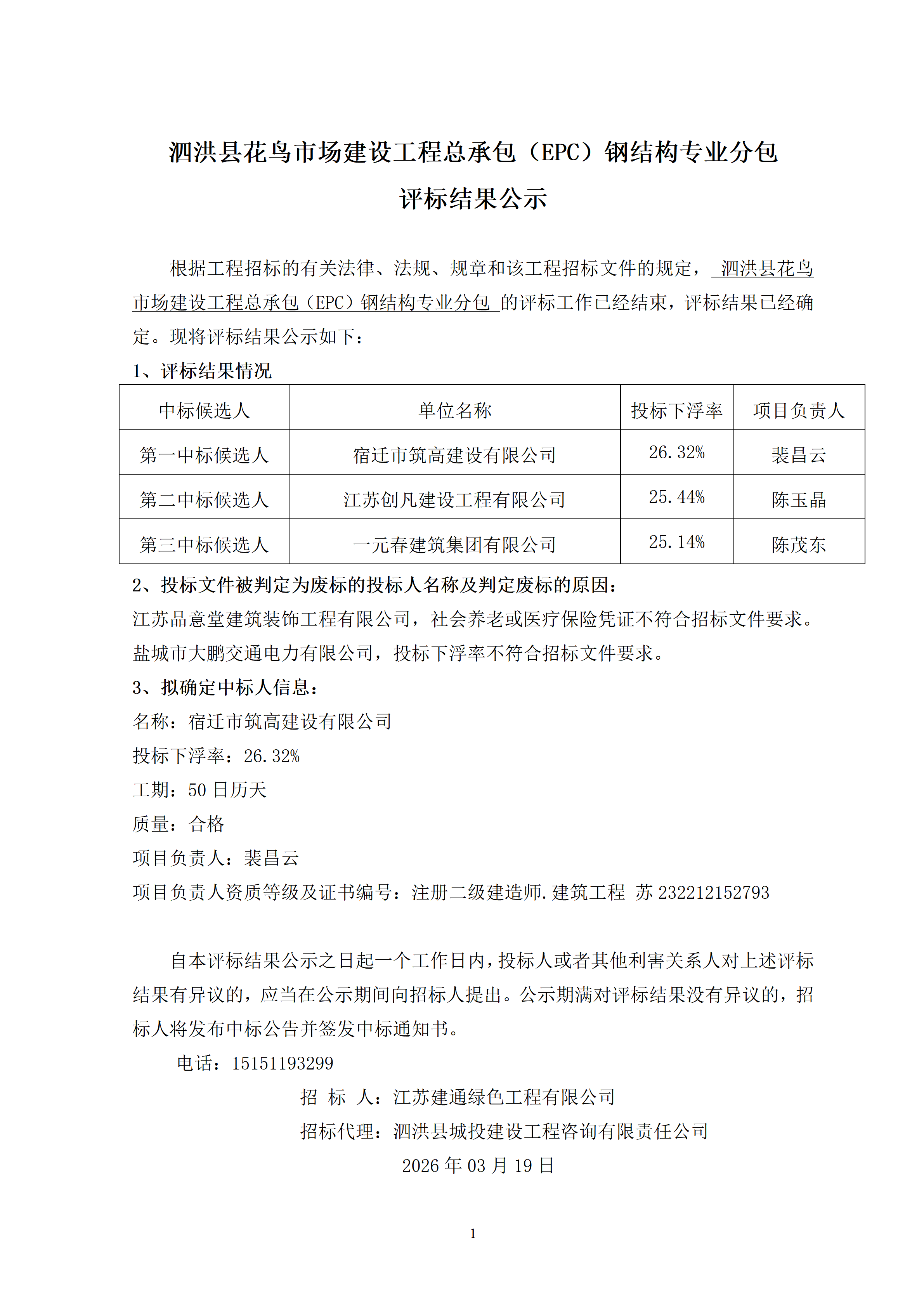 泗洪县花鸟市场建设工程总承包(EPC)钢结构专业分包 评标结果公示