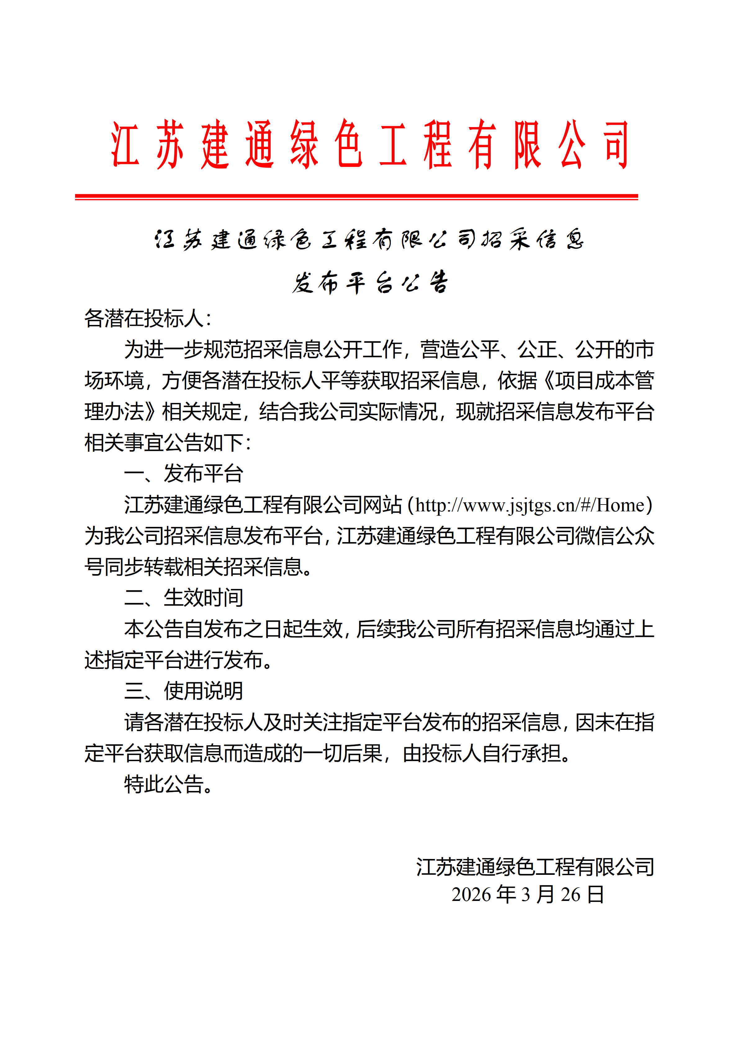 江苏建通绿色工程有限公司招采信息发布平台公告