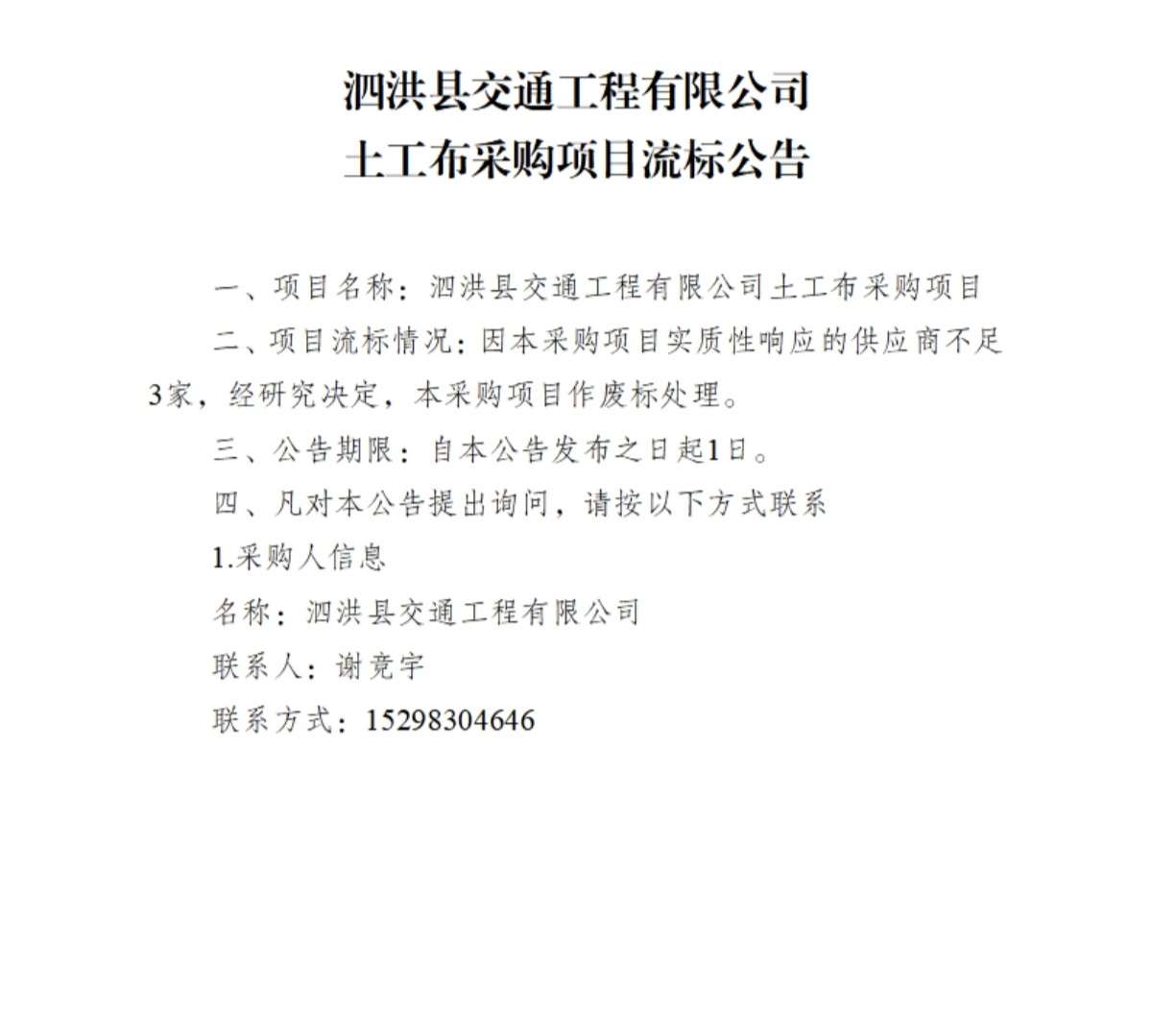 泗洪县交通工程有限公司土工布采购项目流标公告