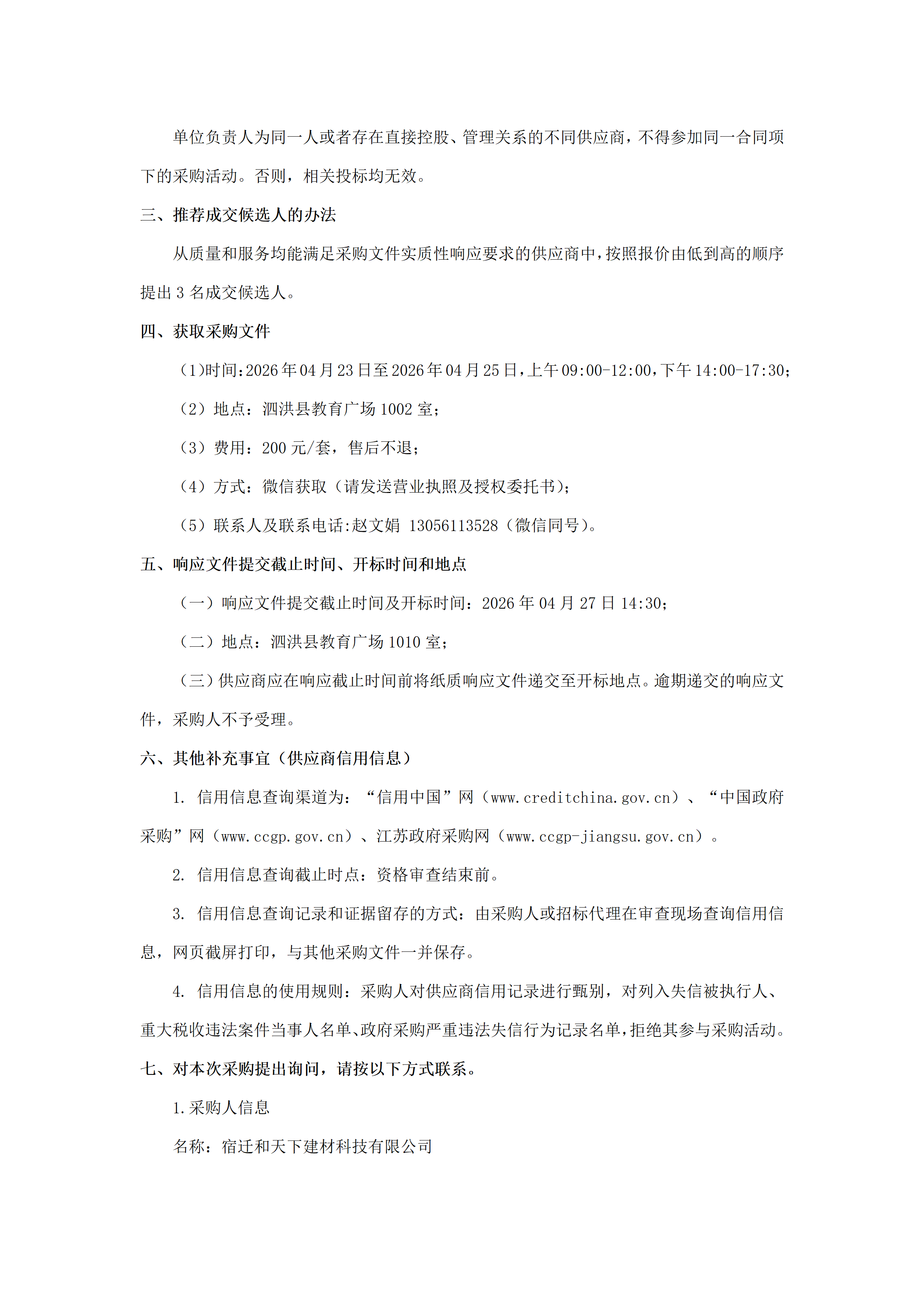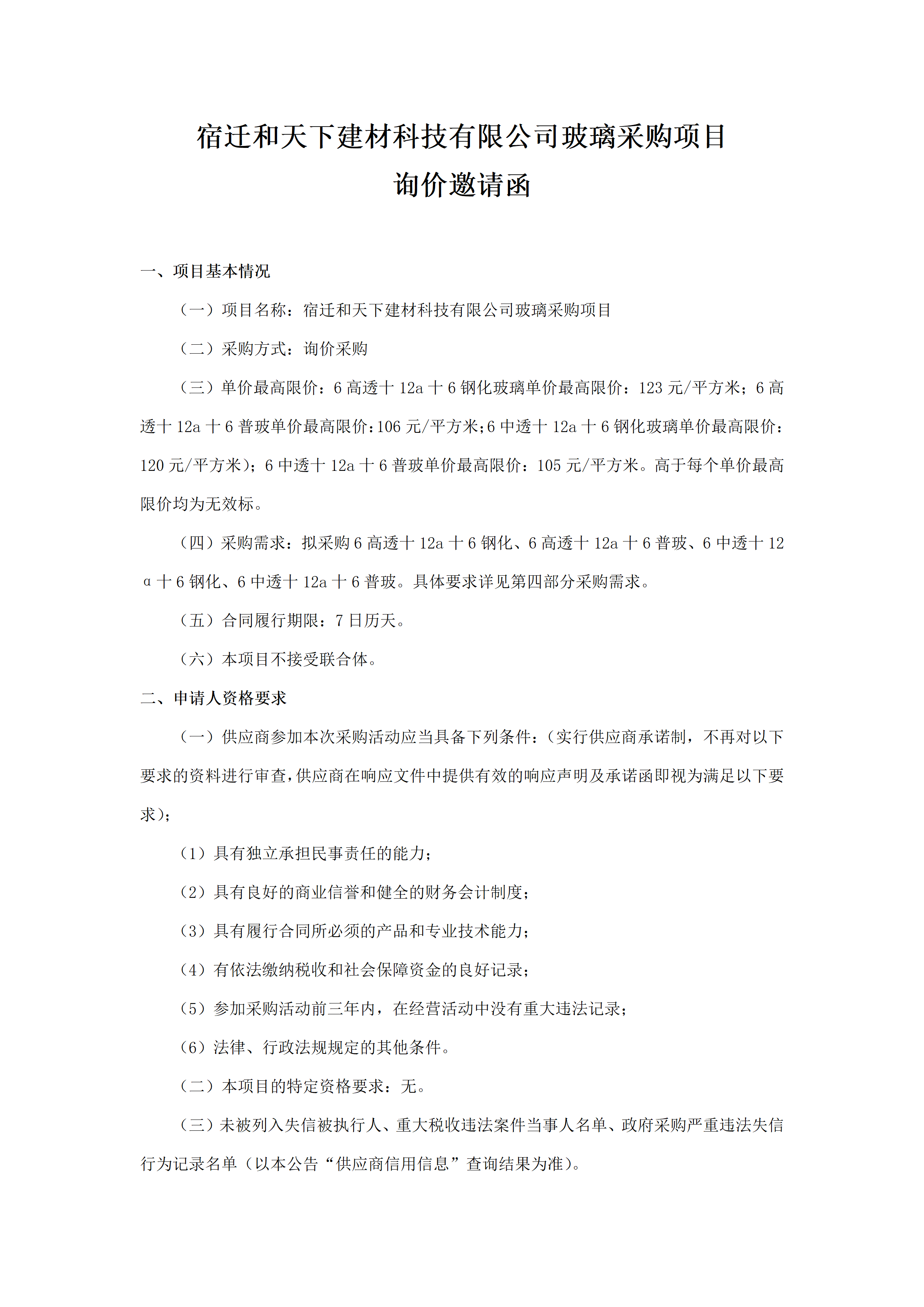 宿迁和天下建材科技有限公司玻璃采购项目 询价邀请函