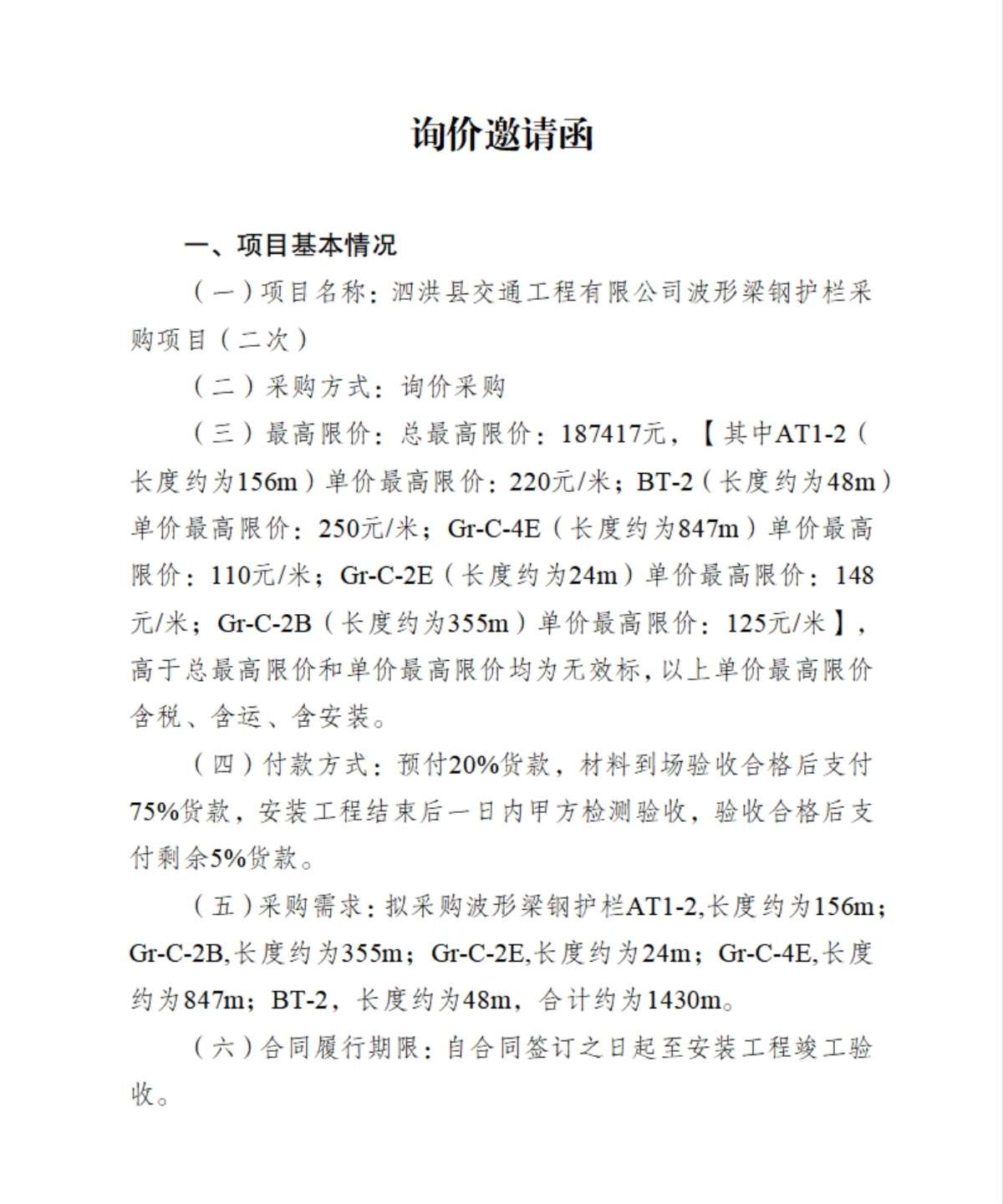 泗洪县交通工程有限公司波形梁钢护栏采购项目(二次)询价邀请函